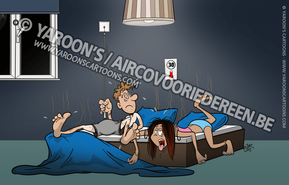 Een komische voor/na setting van een woon- en slaapkamer met mensen die eerst flink afzien vanwege de hitte en later nergens meer last van hebben dankzij hun airco