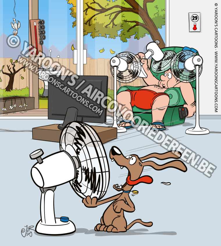 Firma’s Frederikx en Jasper Raman bundelden hun krachten om zo samen volledige, op maat geïnstalleerde, aircosystemen aan te kunnen bieden tegen extra aantrekkelijke prijzen. Voor een opvallende reclame voor hun “Airco voor Iedereen” trokken ze bij Yaroon’s Cartoons aan de bel. De klant’s eigen idee, een klassiek voor-na tafereel, viel een paar weken later in de vorm van een folder met het uiterlijk van een stripalbum op 12.000 adressen in de bus en een geanimeerde variant werd de blikvanger van de nieuwe website www.aircovooriedereen.be.